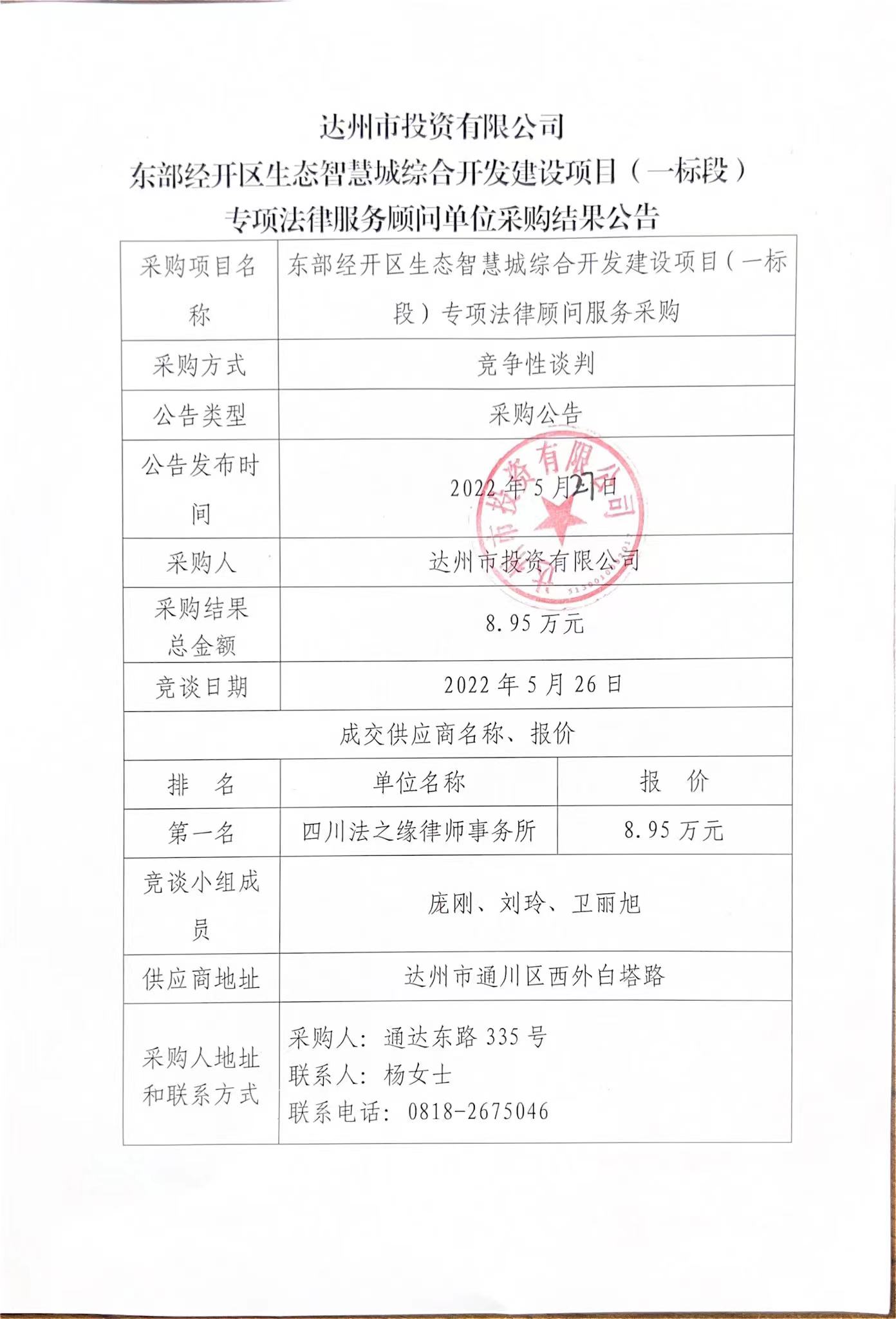 東部經(jīng)開區(qū)生態(tài)智慧城綜合開發(fā)建設(shè)項(xiàng)目(一標(biāo)段)專項(xiàng)法律服務(wù)顧問單位采購結(jié)果公告